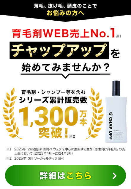 薄毛や抜け毛にお悩みの方、8年連続WEB売上NO.1※のCHAP UP(チャップアップ)がおすすめです。